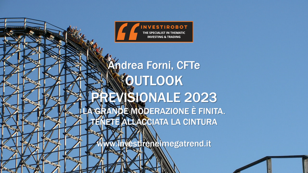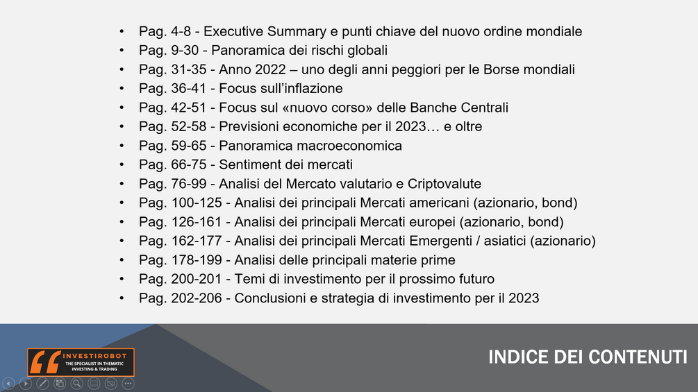 Il nuovo Outlook Previsionale dei Mercati Finanziari 2023 (arrivato alla undicesima edizione) è un documento di ricerca pubblicato a inizio anno di 206 slides in formato pdf e un video di 3,5 ore di analisi che combina analisi tecnica, analisi intermarket, economia e geopolitica per identificare l'attuale scenario dei mercati e le previsioni delle tendenze dei prossimi dodici mesi.