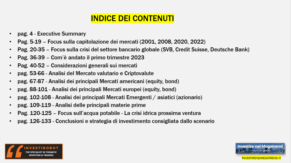 Acquistando questo prodotto riceverete un file pdf con 133 slides liberamente scaricabile e stampabile e una video-analisi di 120 minuti con la dettagliata spiegazione di tutti i grafici presentati nel report.