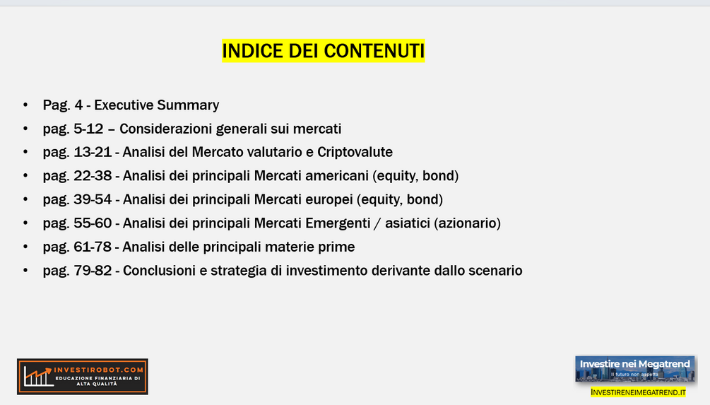 Acquistando questo prodotto ricevete un file pdf con 82 slides liberamente scaricabile e stampabile e una video-analisi di un'ora con la dettagliata spiegazione di tutti i grafici presentati nel report.