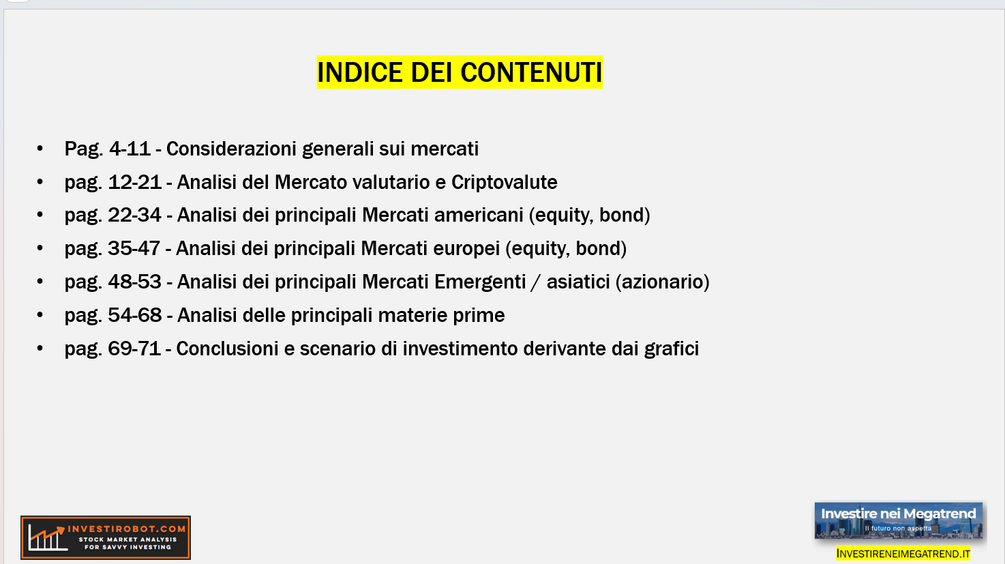 Acquistando questo prodotto ricevete un file pdf con 70 slides liberamente scaricabile e stampabile e una video-analisi di un'ora con la dettagliata spiegazione di tutti i grafici presentati nel report.